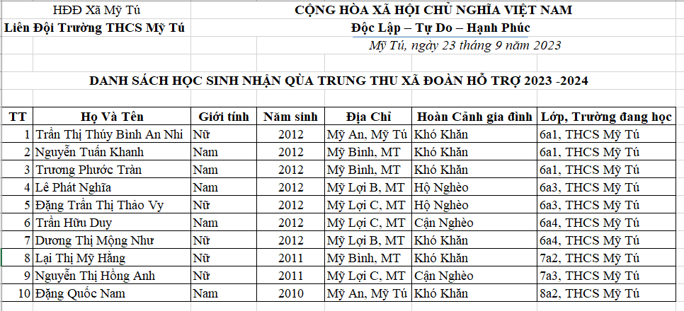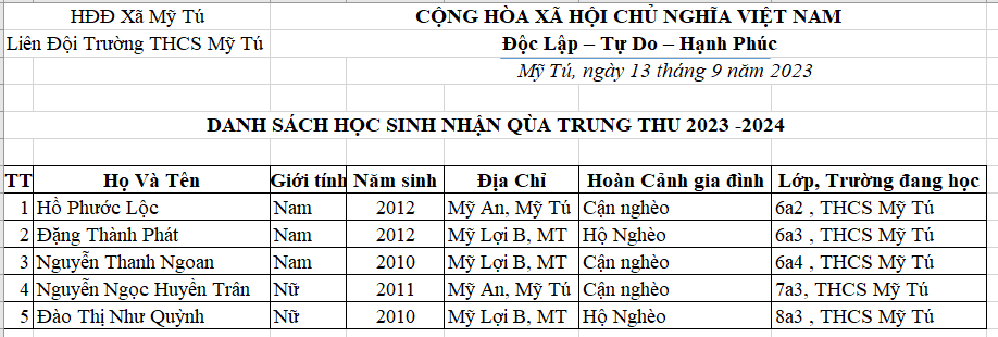 Trường THCS Mỹ Tú lập danh sách đề nghị cho học sinh nhận quà trung thu của huyện và xã Mỹ Tú.