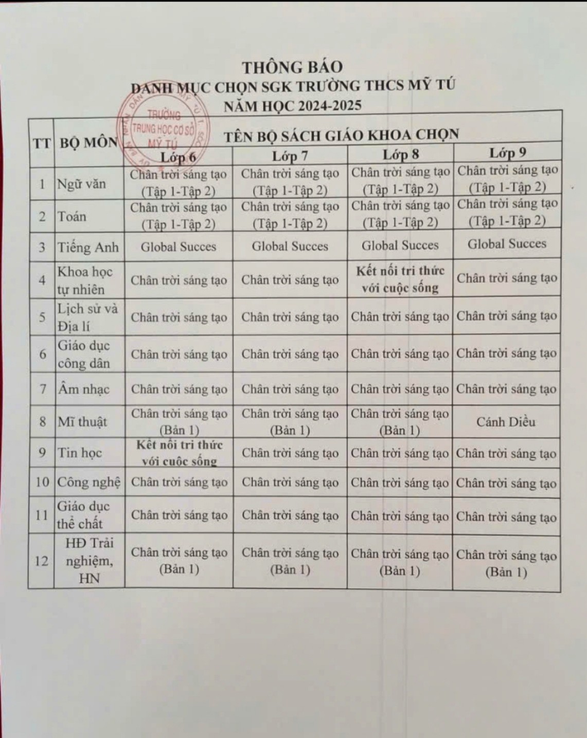 DANH MỤC SÁCH GIÁO KHOA NĂM 2024- 2025