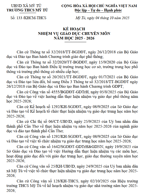 KẾ HOẠCH CHUYÊN MÔN NĂM 2025-2026 TRƯỜNG THCS MỸ TÚ