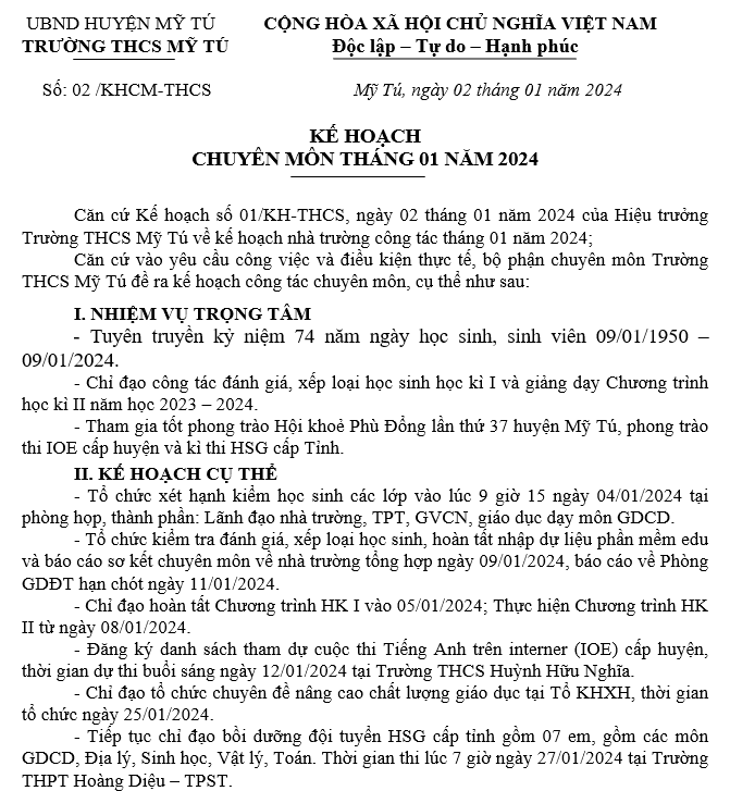 KẾ HOẠCH CHUYÊN MÔN THÁNG 01/2024