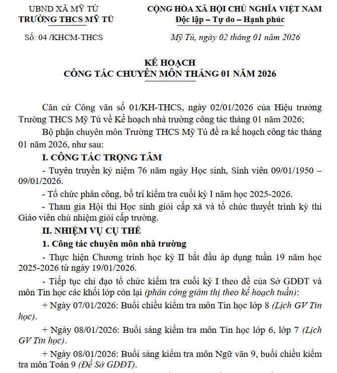 KẾ HOẠCH CHUYÊN MÔN THÁNG 01/2026