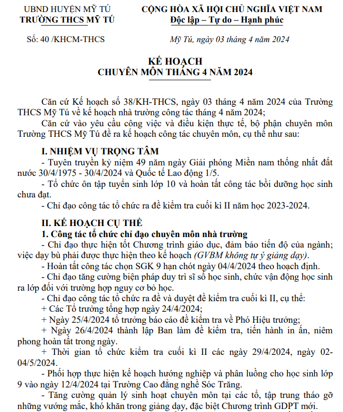KẾ HOẠCH CHUYÊN MÔN THÁNG 04/2024
