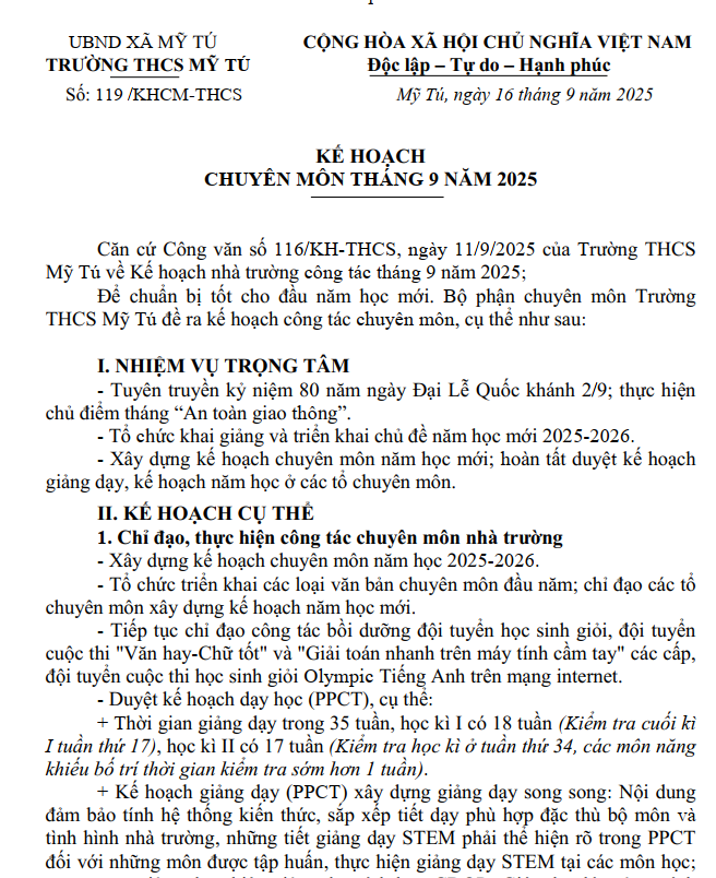 KẾ HOẠCH CHUYÊN MÔN THÁNG 09/2025