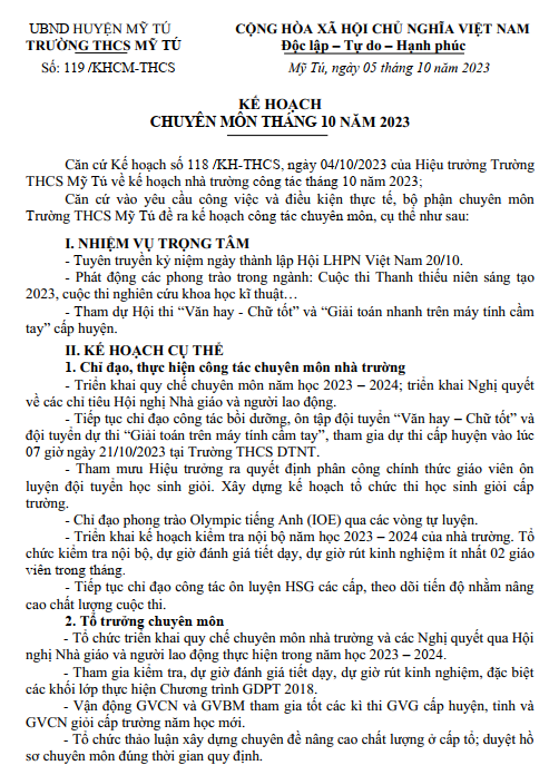 KẾ HOẠCH CHUYÊN MÔN THÁNG 10