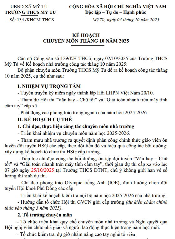 KẾ HOẠCH CHUYÊN MÔN THÁNG 10/2025