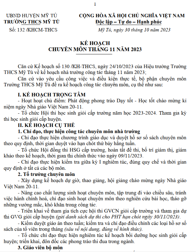 KẾ HOẠCH CHUYÊN MÔN THÁNG 11/2023
