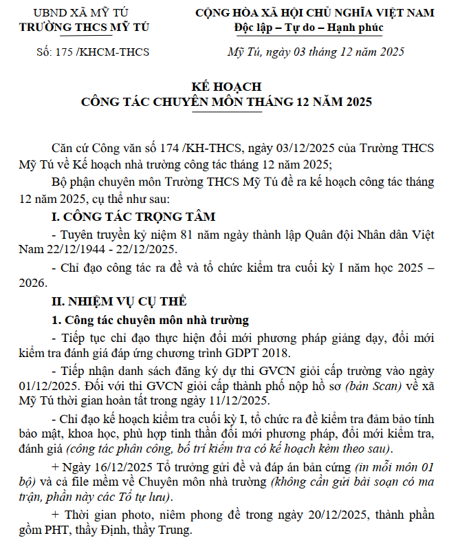 KẾ HOẠCH CHUYÊN MÔN THÁNG 12/2025