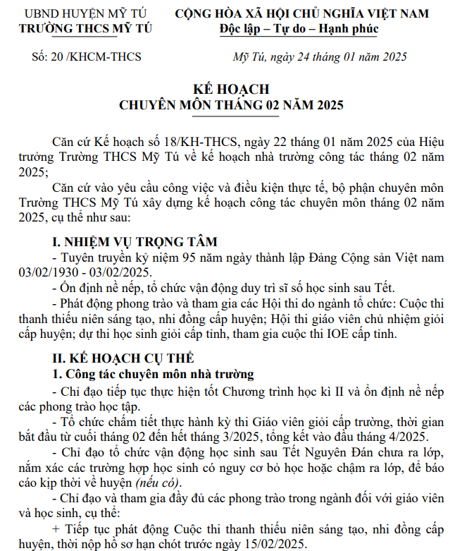 KẾ HOẠCH CHUYÊN MÔN THÁNG 2/2025