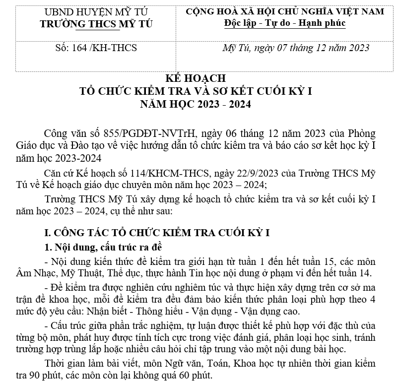 KẾ HOẠCH TỔ CHỨC KIỂM TRA VÀ SƠ KẾT HK1