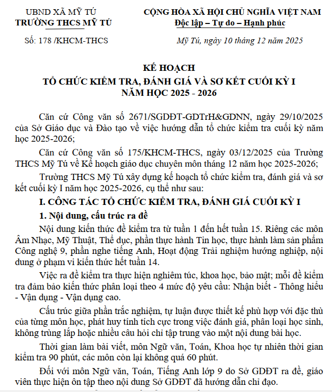 LỊCH KIỂM TRA CUỐI KỲ I NĂM HỌC 2025-2026