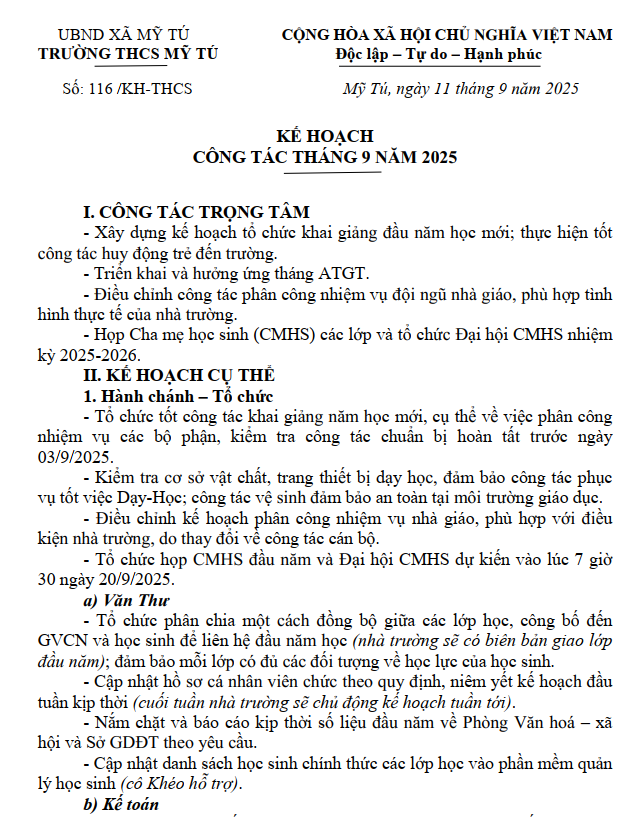 KẾ HOẠCH NHÀ TRƯỜNG THÁNG 09/2025