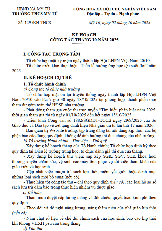 KẾ HOẠCH NHÀ TRƯỜNG THÁNG 10/2025