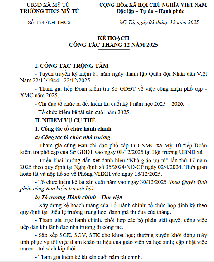 KẾ HOẠCH NHÀ TRƯỜNG THÁNG 12/2025