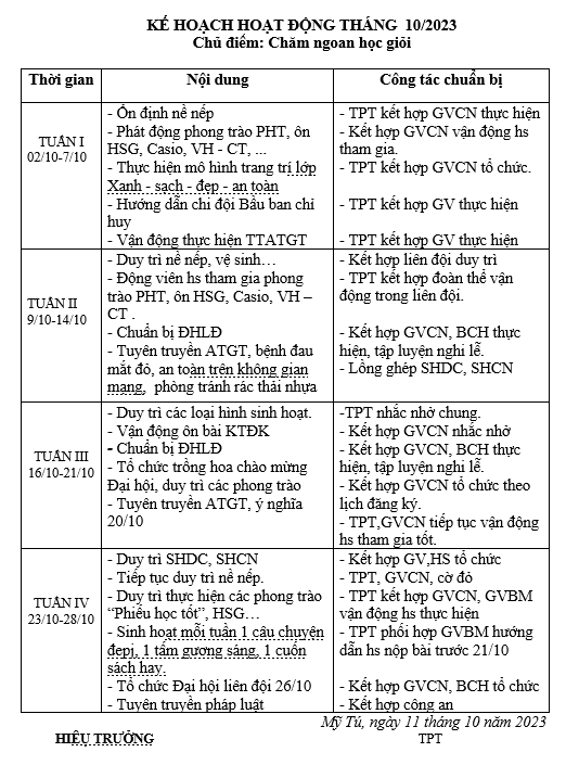 KẾ HOẠCH THÁNG 10/23 LIÊN ĐỘI