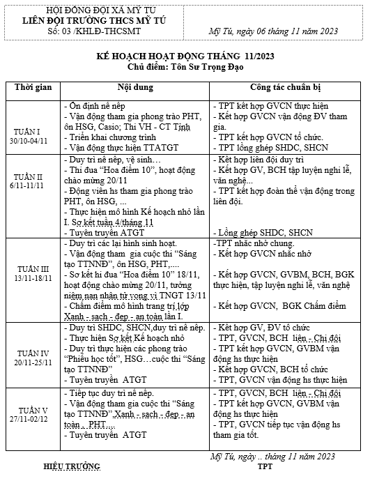 KẾ HOẠCH THÁNG 11/23 LIÊN ĐỘI