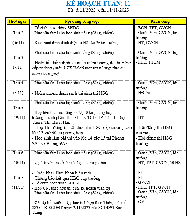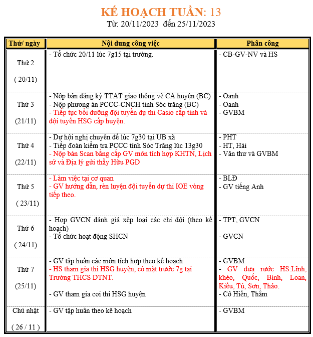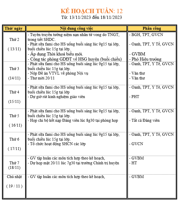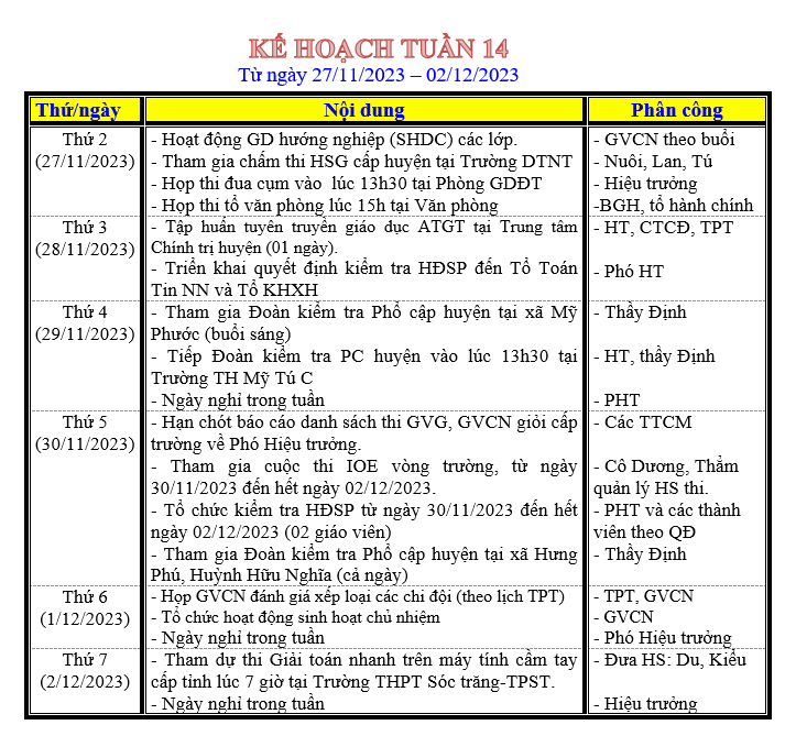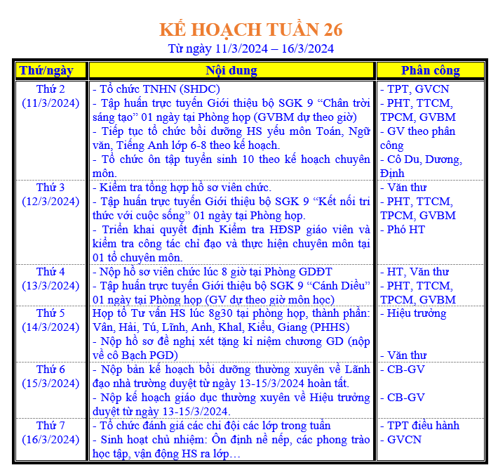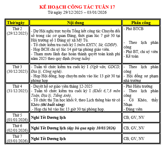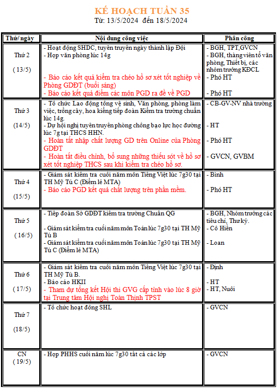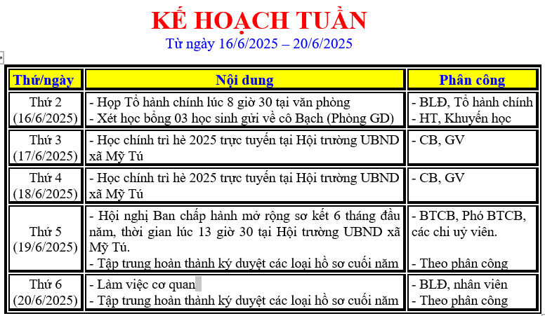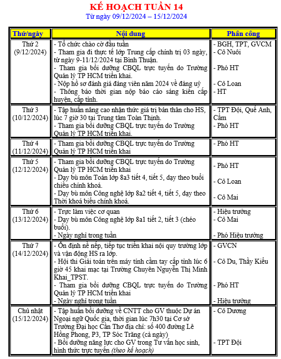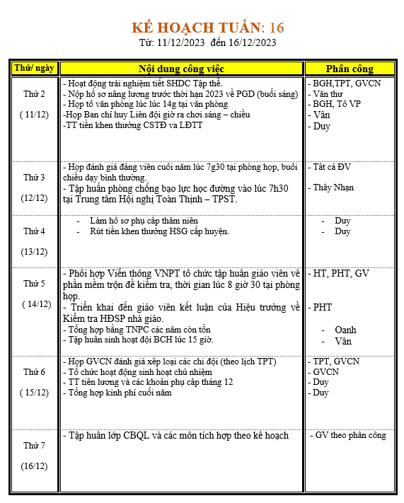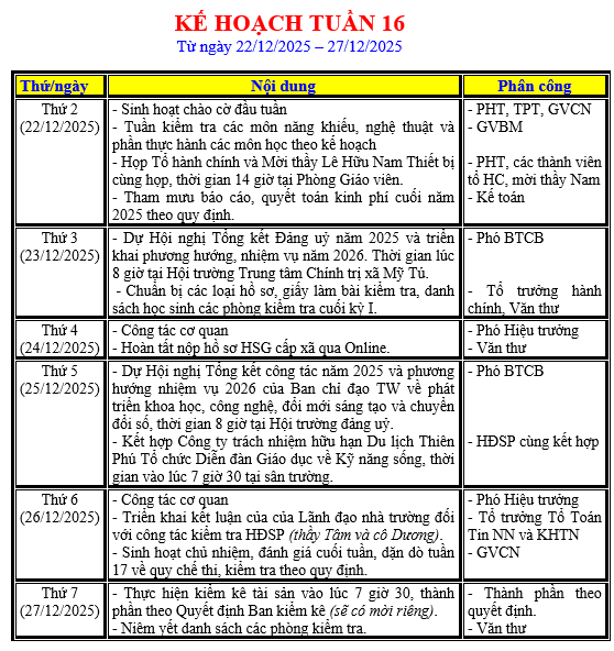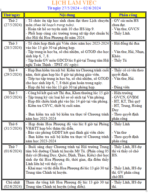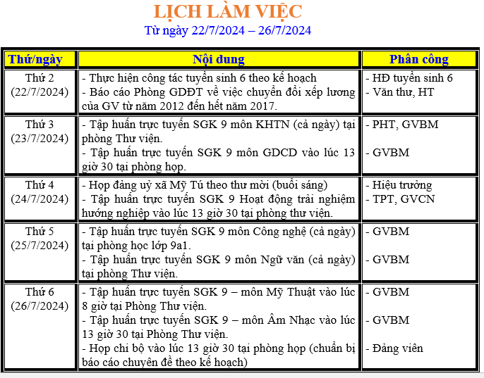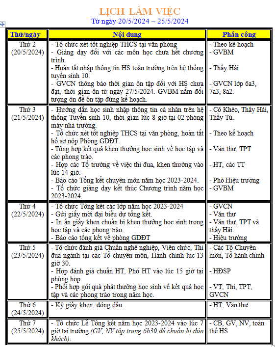 LỊCH LÀM VIỆC TRONG TUẦN
