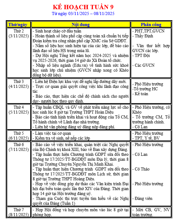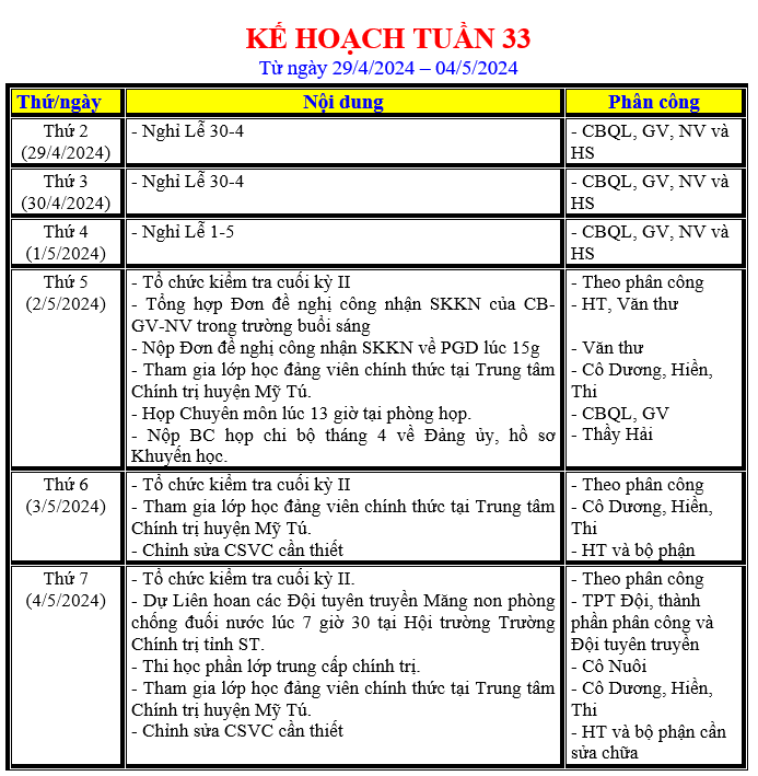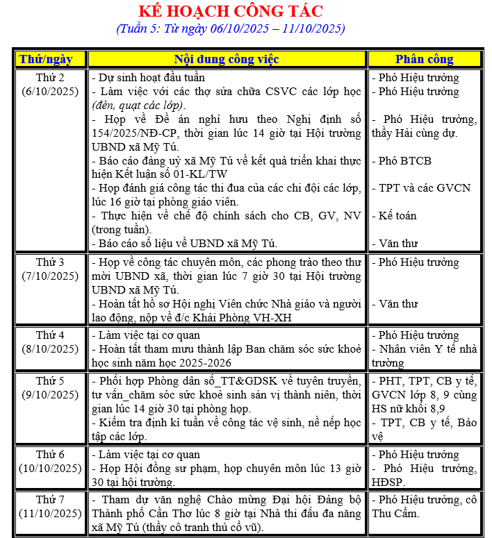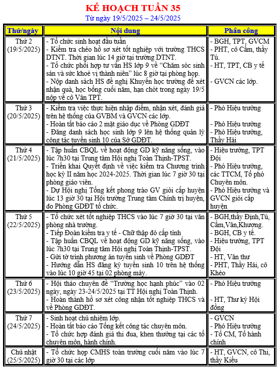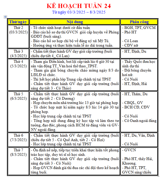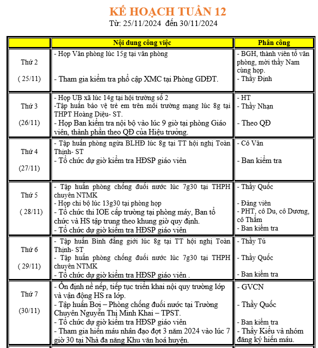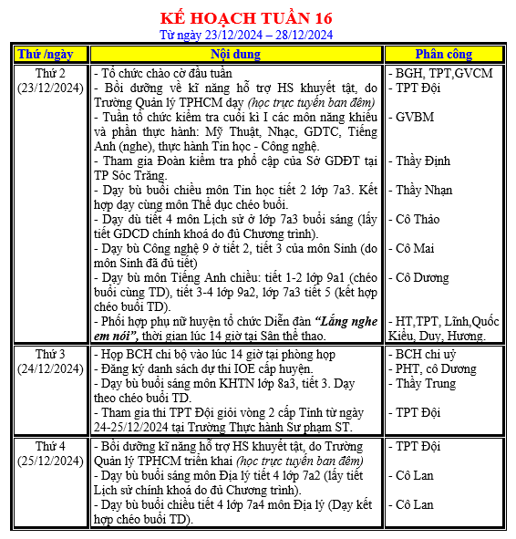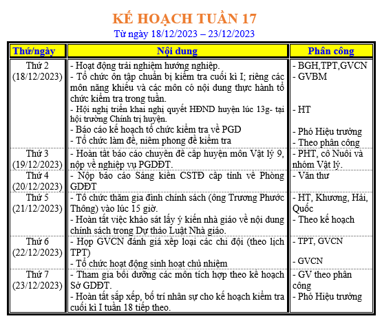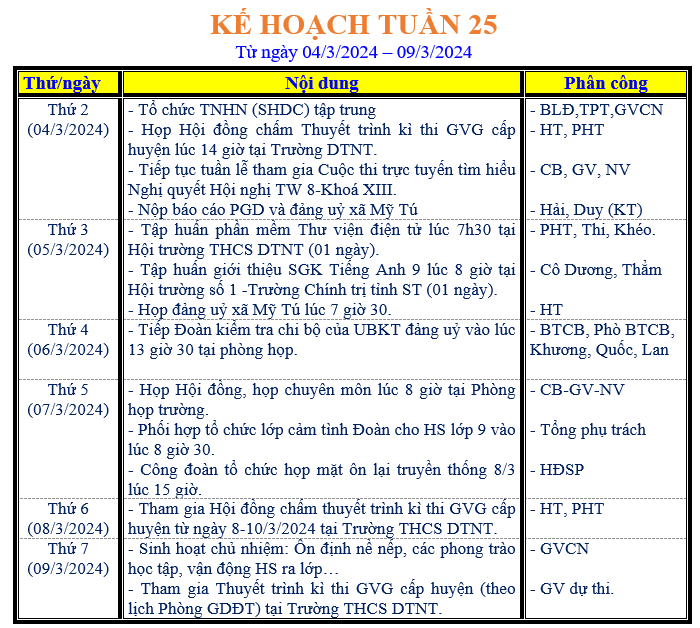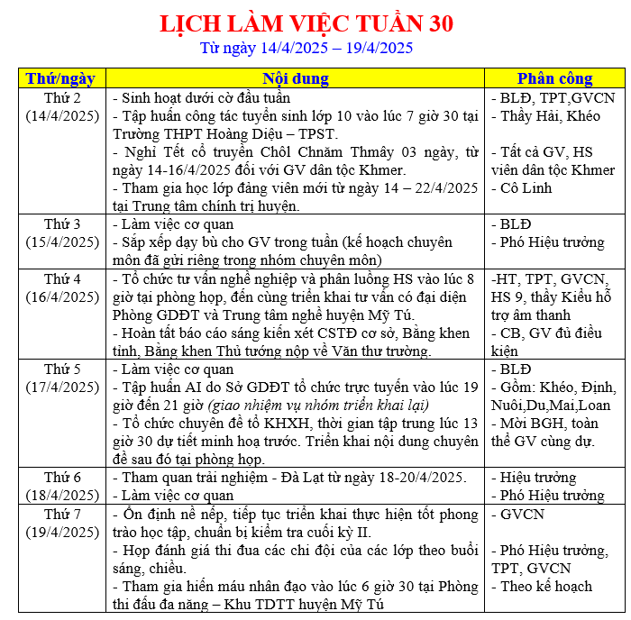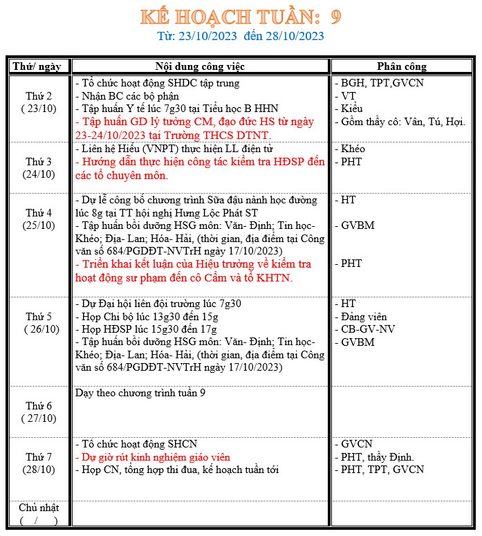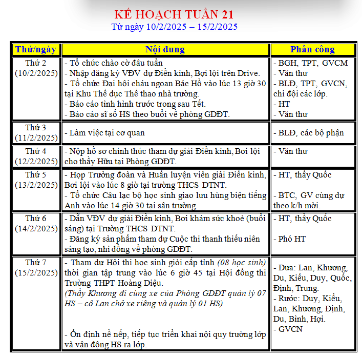 LỊCH LÀM VIỆC TRONG TUẦN