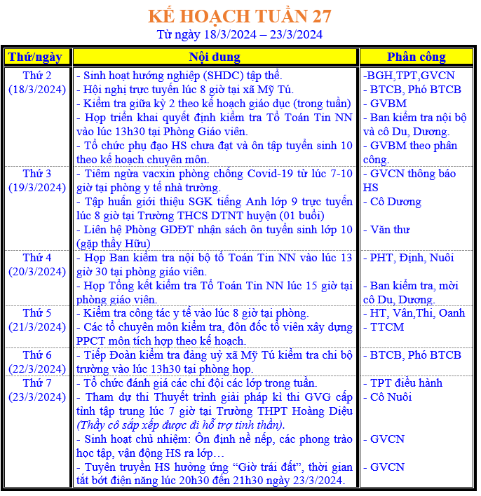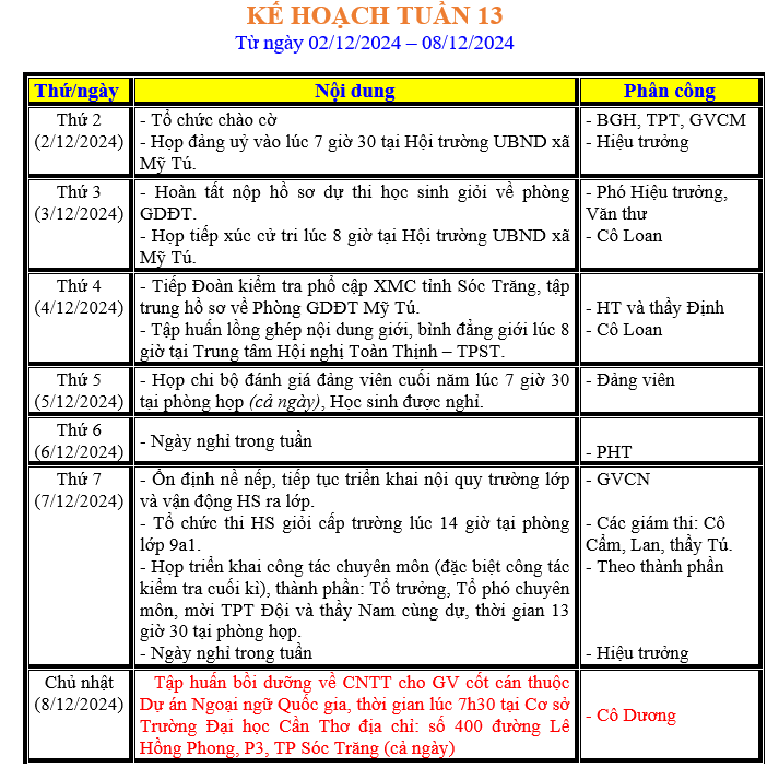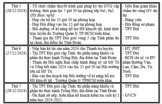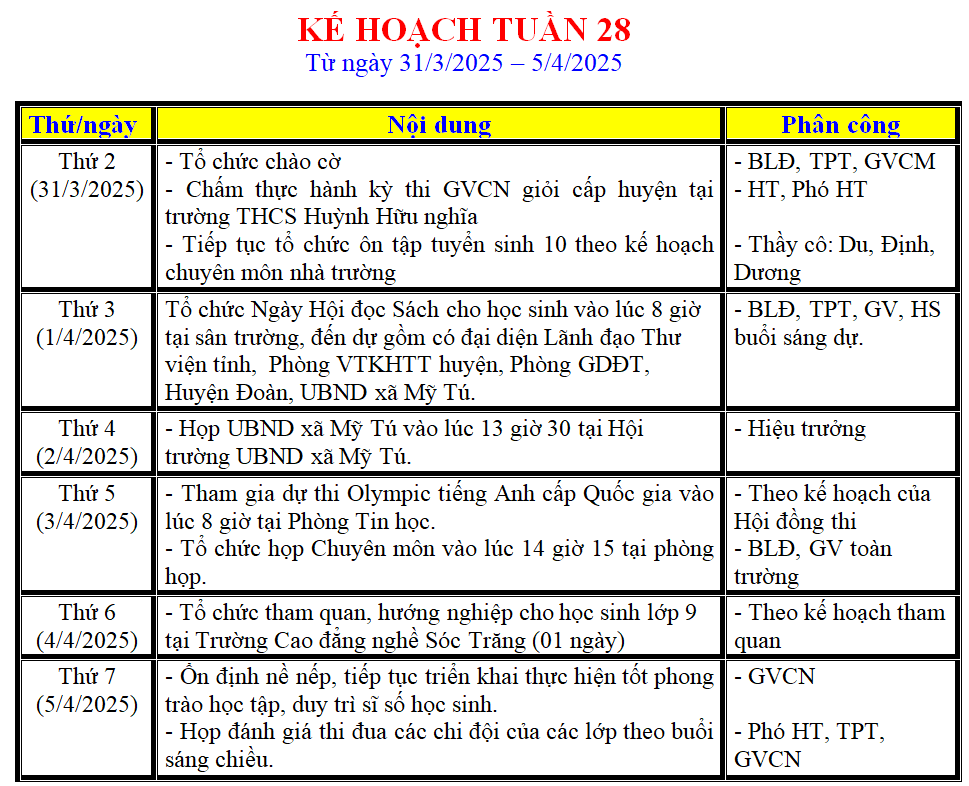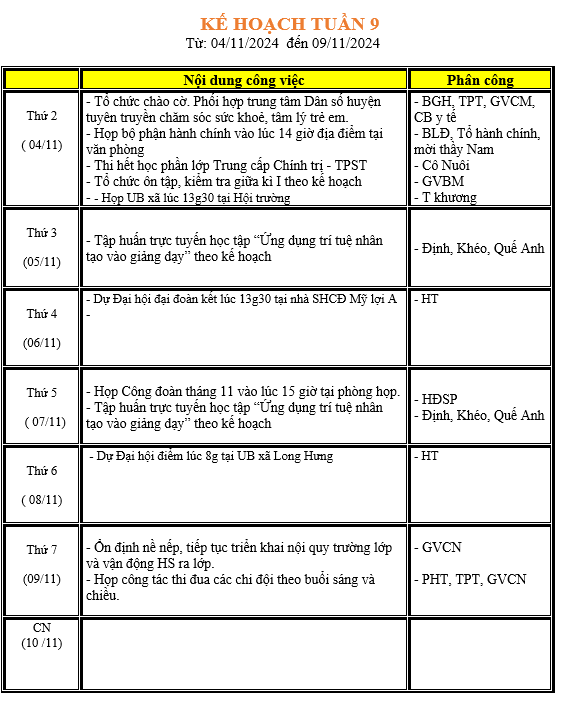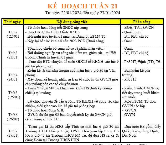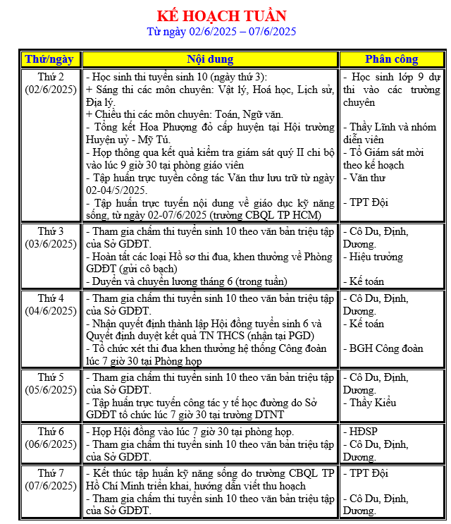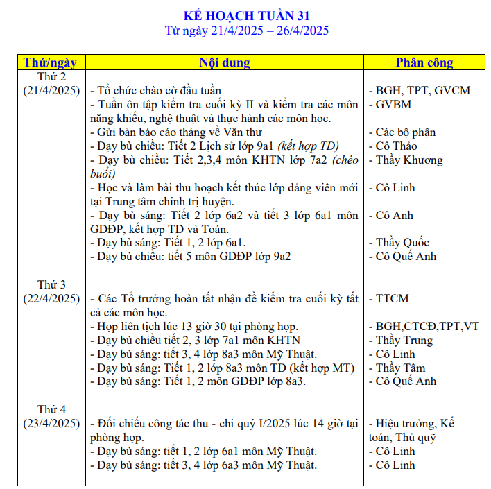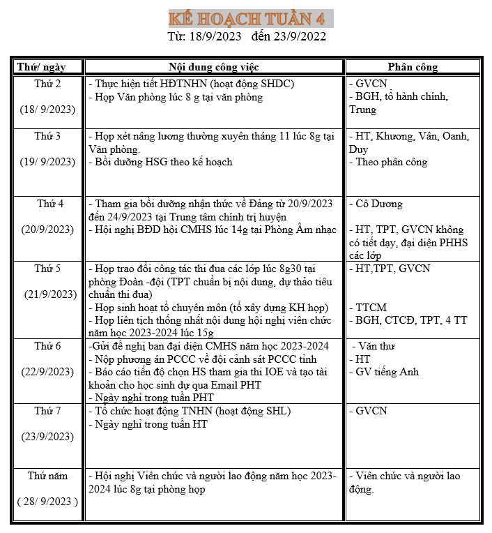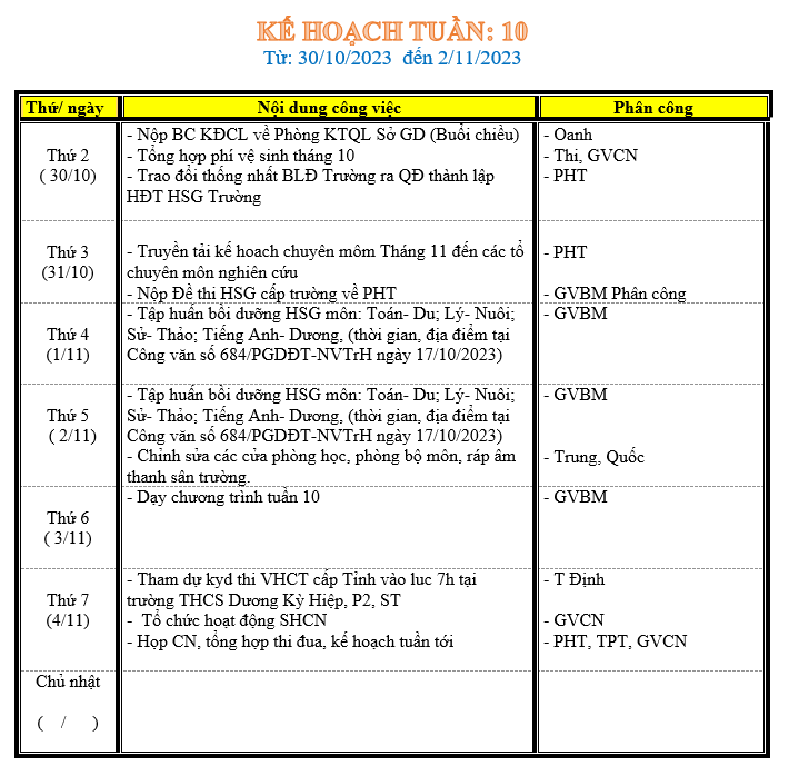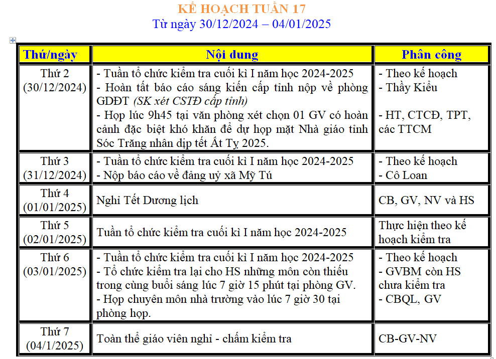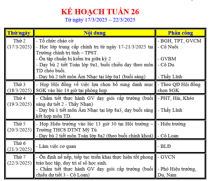 LỊCH LÀM VIỆC TRONG TUẦN
