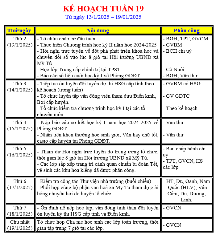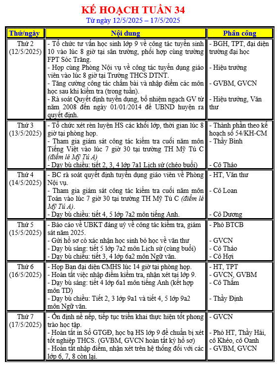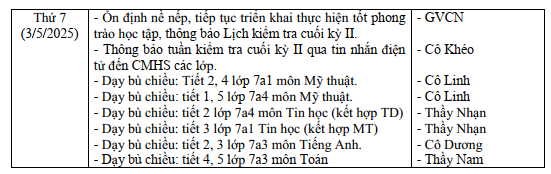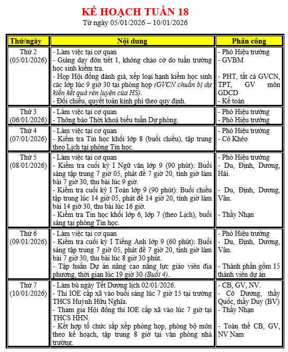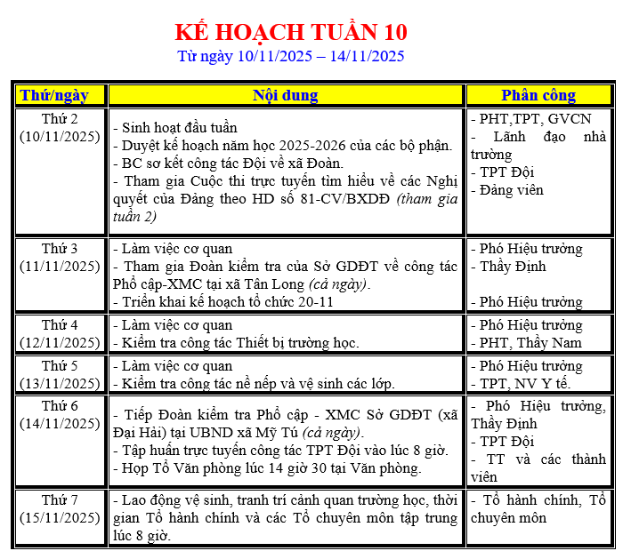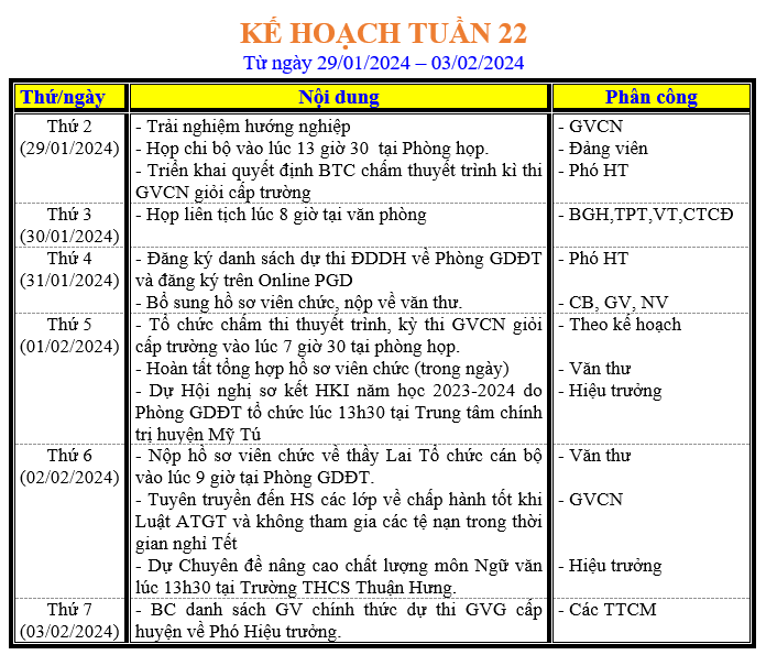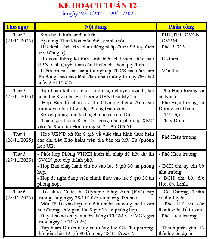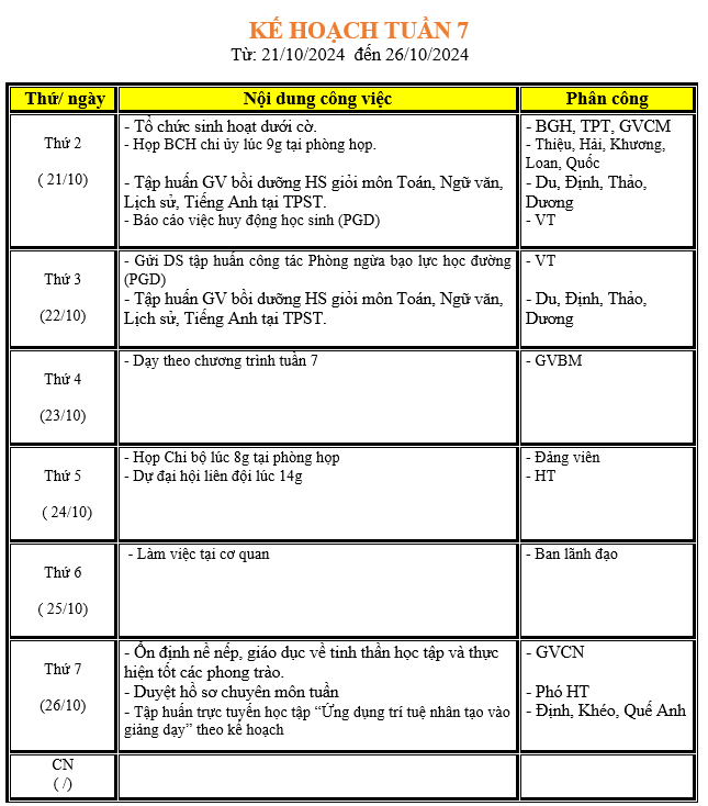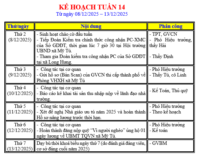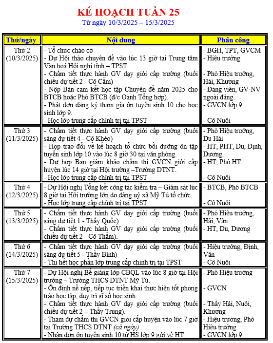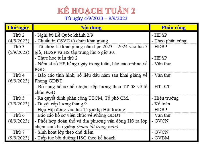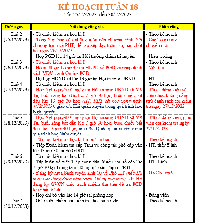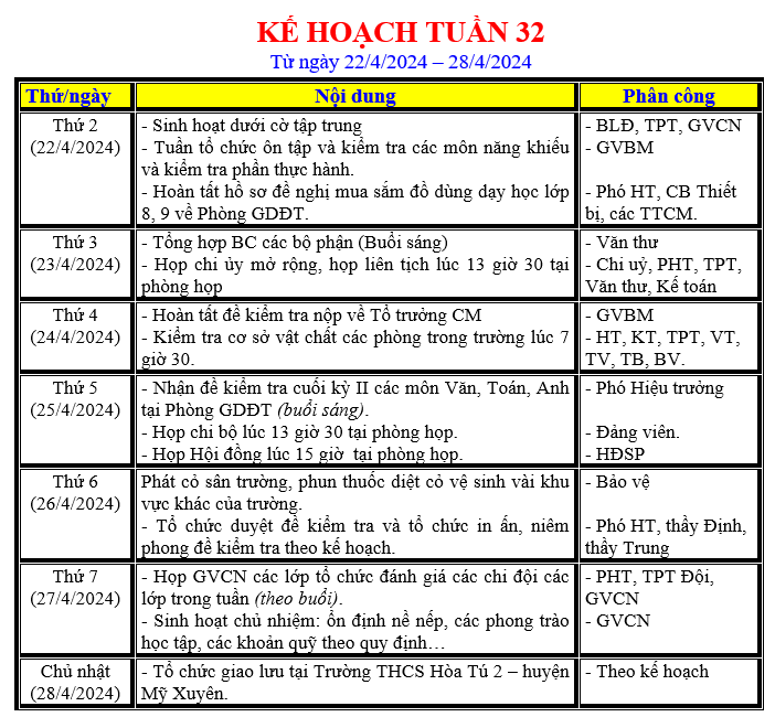 LỊCH LÀM VIỆC TRONG TUẦN