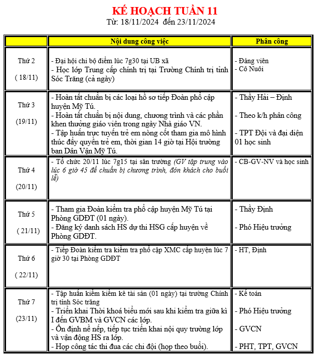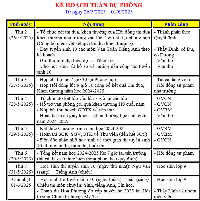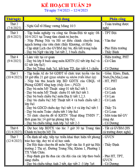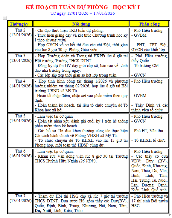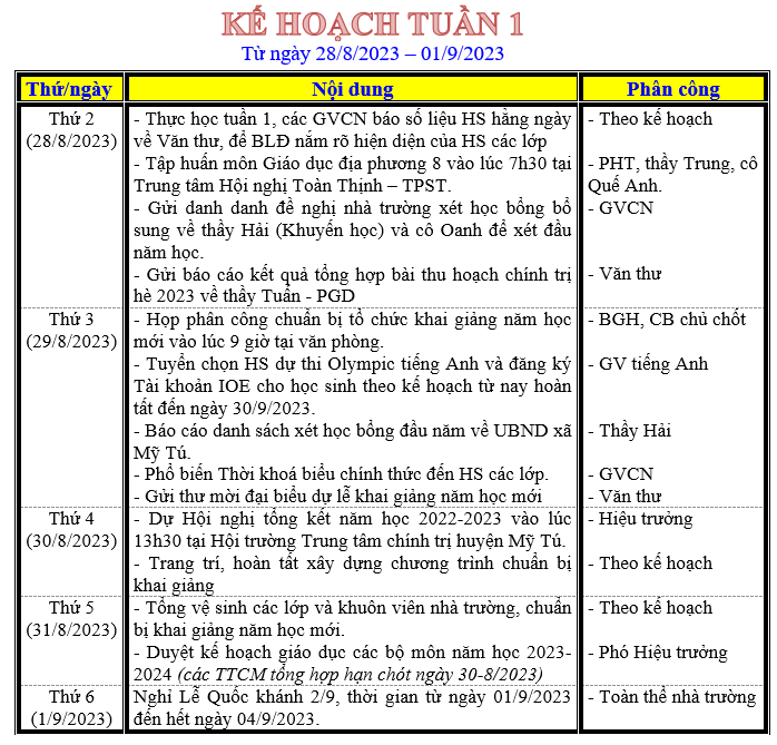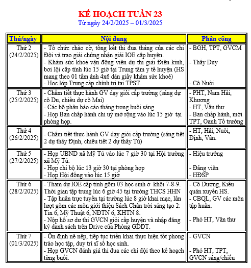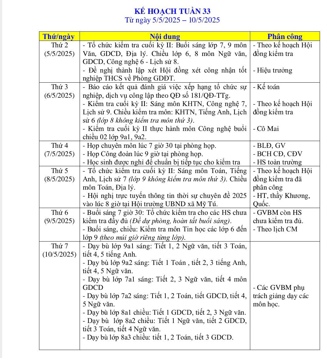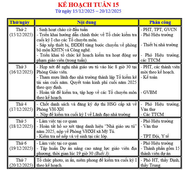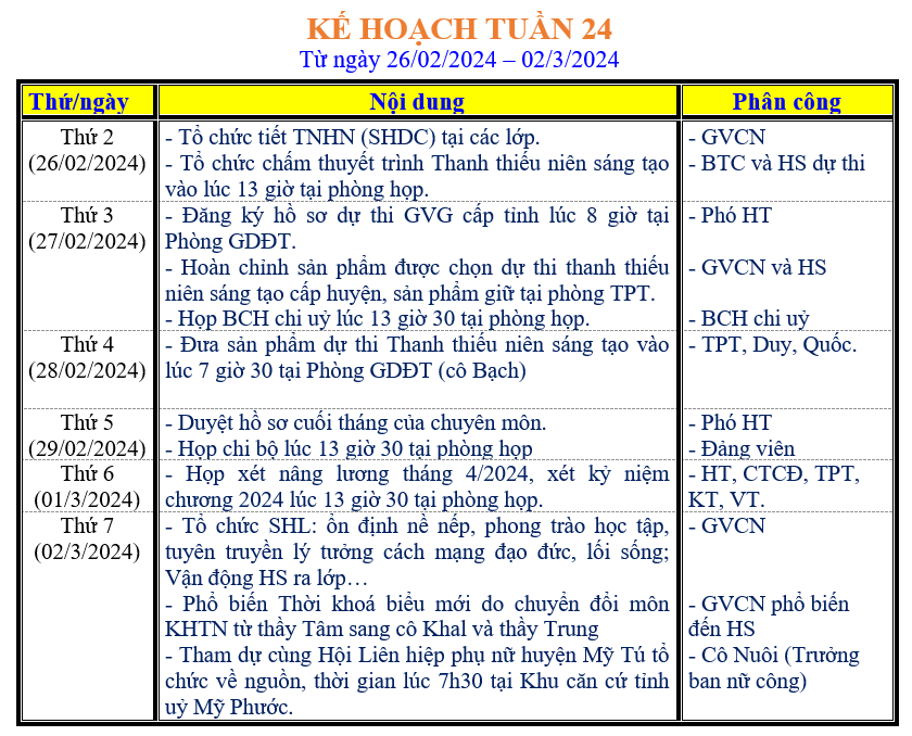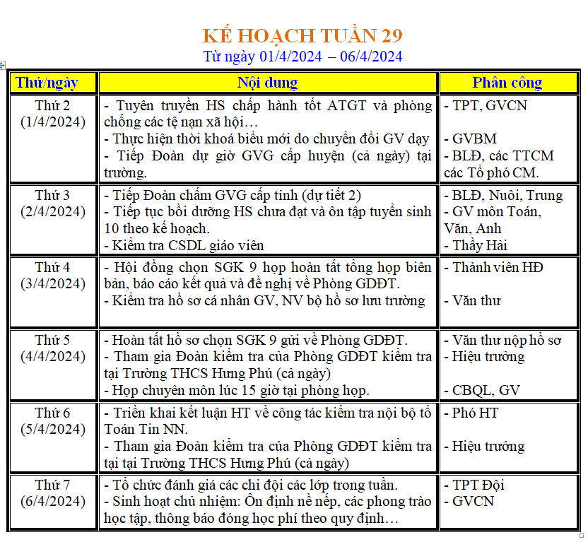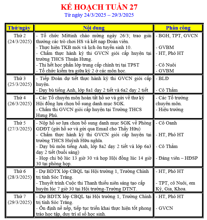 LỊCH LÀM VIỆC TRONG TUẦN