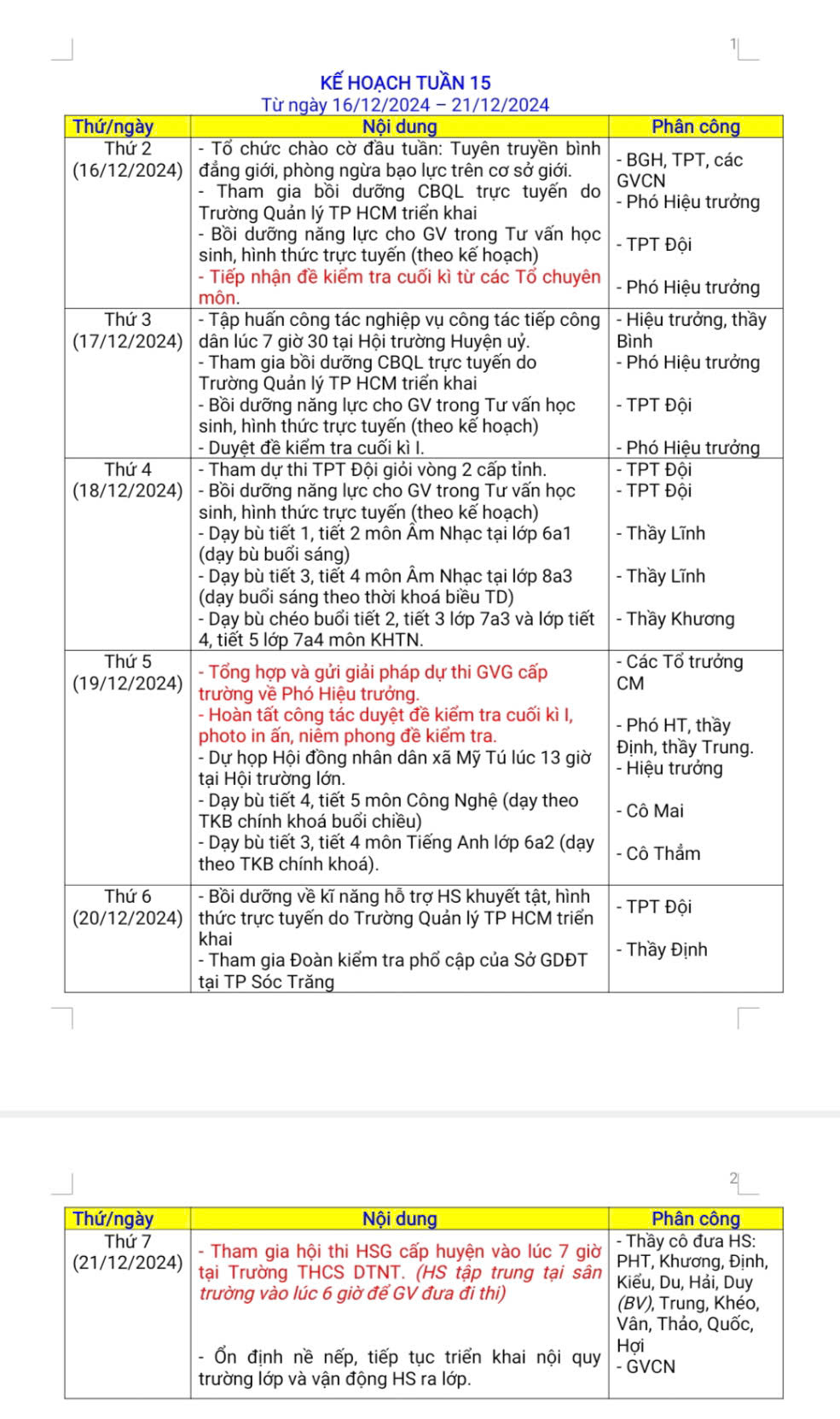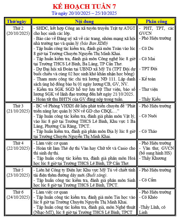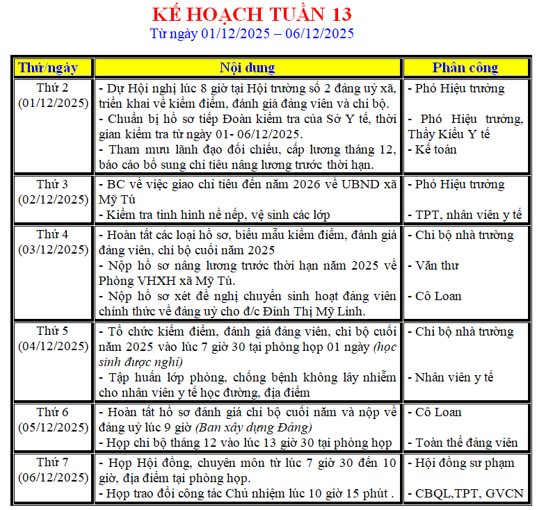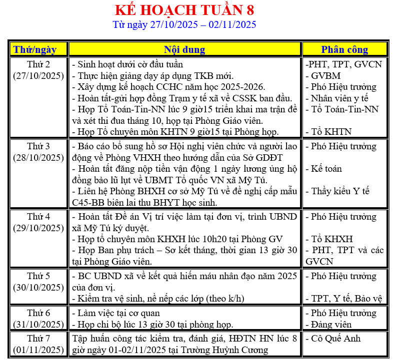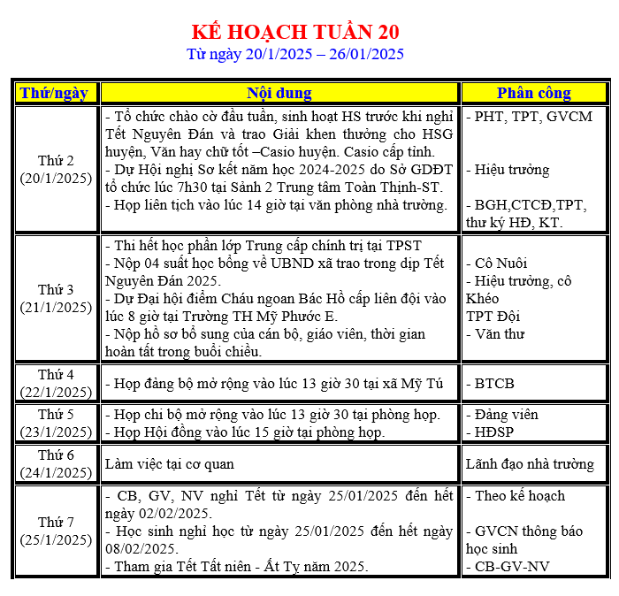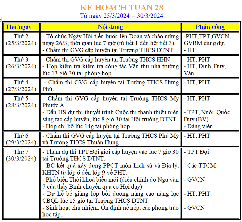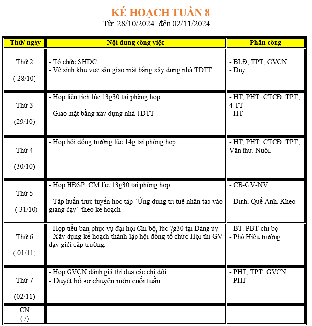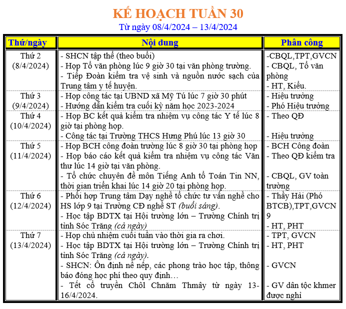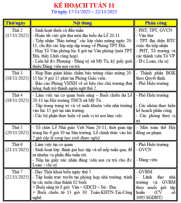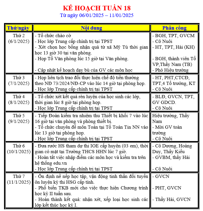 LỊCH LÀM VIỆC TRONG TUẦN
