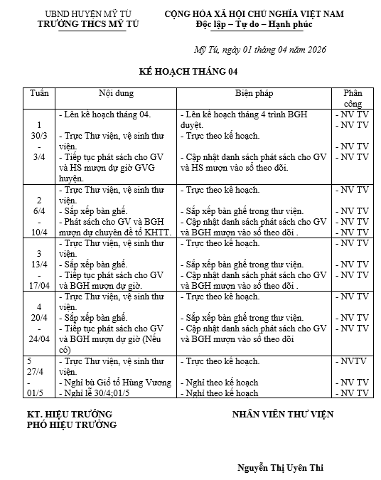 KẾ HOẠCH THƯ VIỆN THÁNG 04/2026