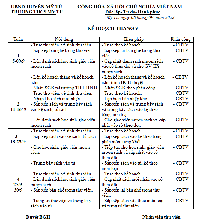 KẾ HOẠCH THƯ VIỆN THÁNG 9/2023