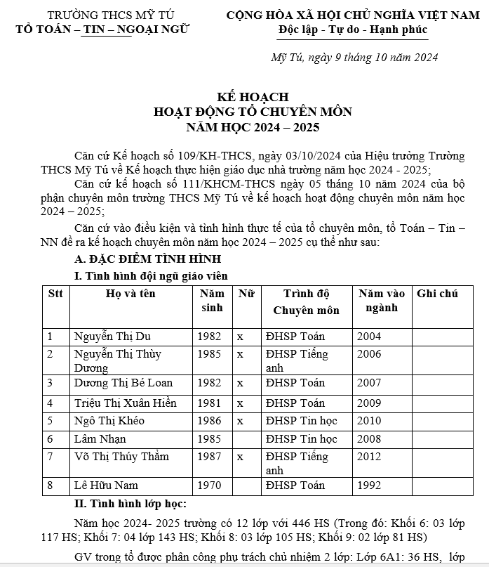 KẾ HOẠCH NĂM TỔ TOÁN- TIN- NN 2024- 2025