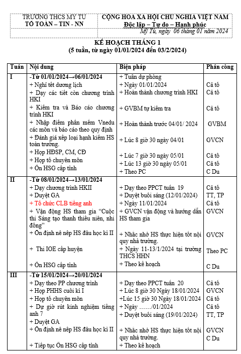 KẾ HOẠCH THÁNG 01/2024 TOÁN- TIN -NN