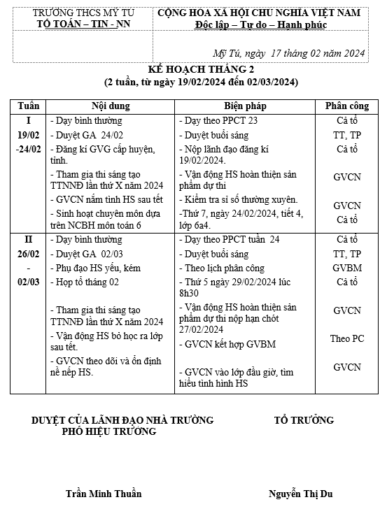 KẾ HOẠCH THÁNG 02/2024 TOÁN- TIN -NN