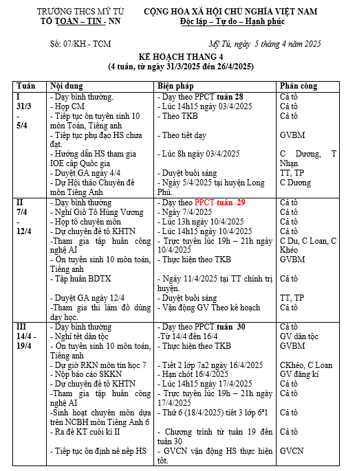 KẾ HOẠCH THÁNG 04/2025 TOÁN- TIN -NN