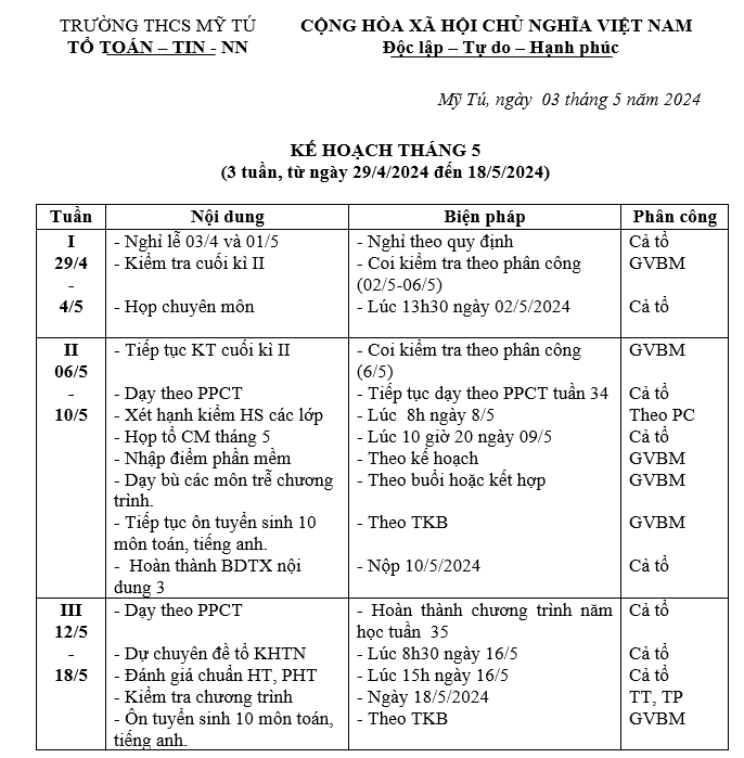 KẾ HOẠCH THÁNG 05/2024 TOÁN- TIN -NN