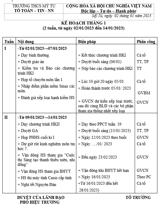 KẾ HOẠCH THÁNG 1 TỔ TOÁN- TIN- NN