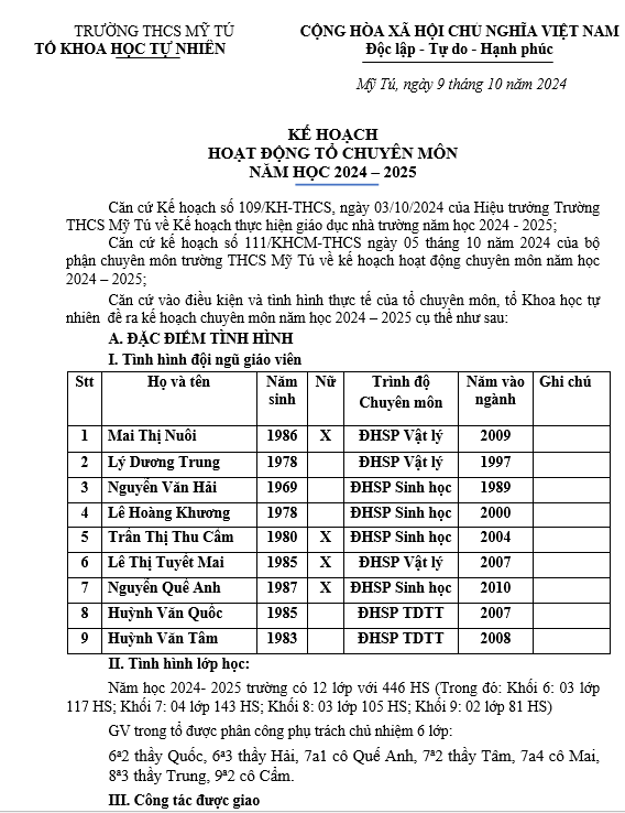 KẾ HOẠCH NĂM 2024-2025 TỔ TỰ NHIÊN