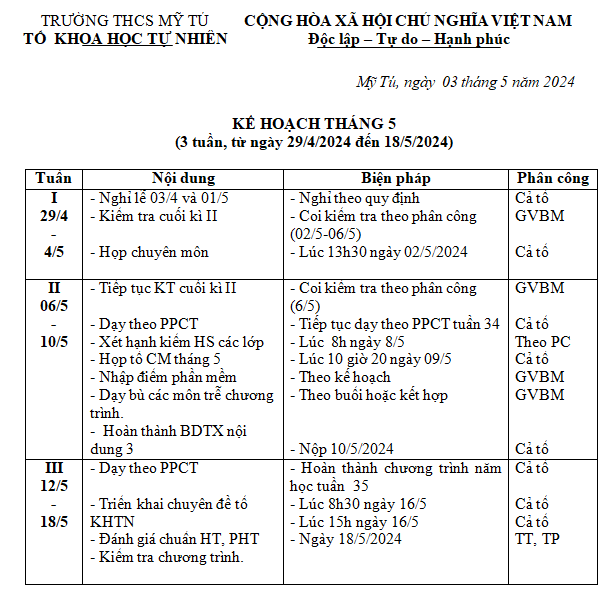 KẾ HOẠCH THÁNG 05/24 TN