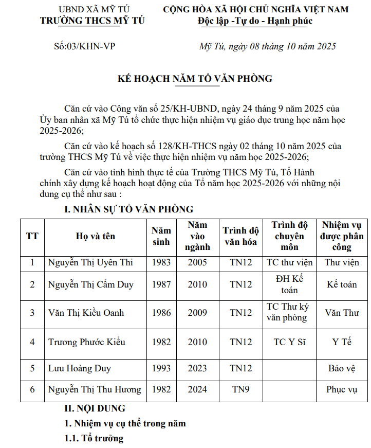 KẾ HOẠCH NĂM 2025-2026 TỔ VĂN PHÒNG