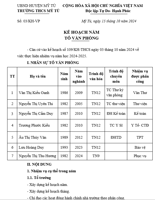 KẾ HOẠCH TỔ VĂN PHÒNG NĂM 2024-2025