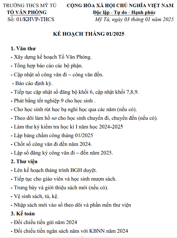 KẾ HOẠCH TỔ VĂN PHÒNG THÁNG 01/2025