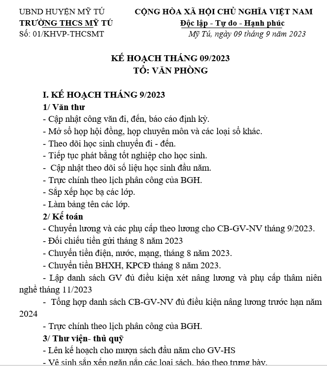 KẾ HOẠCH TỔ VĂN PHÒNG THÁNG 09/23