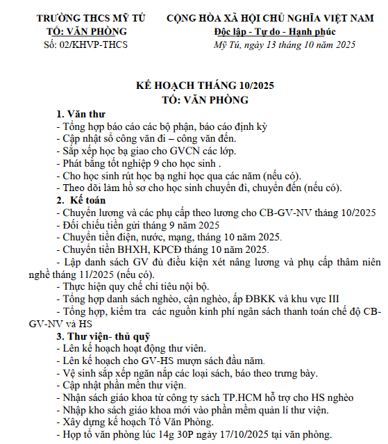 KẾ HOẠCH VĂN PHÒNG THÁNG 10/2025