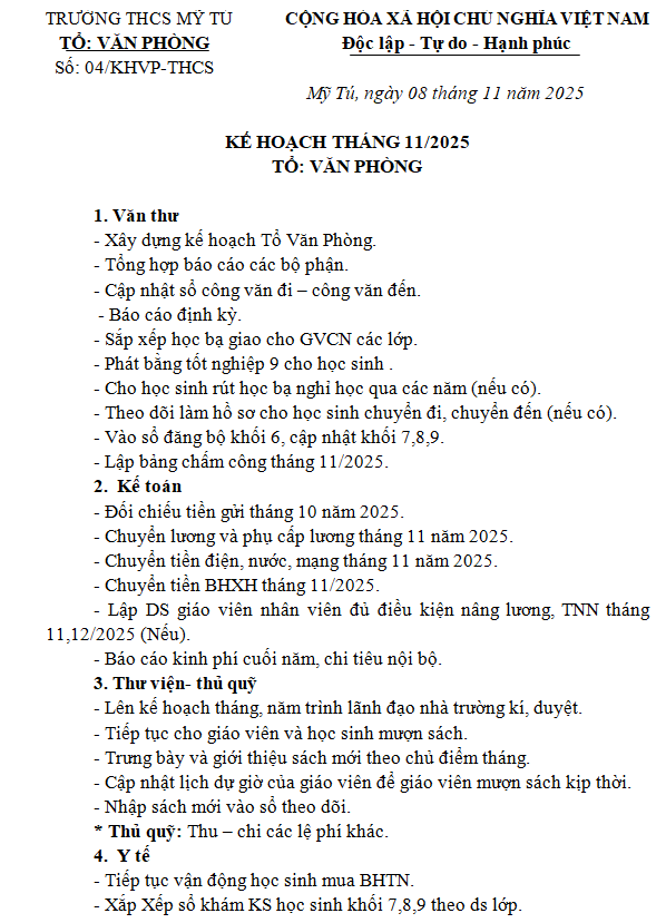 KẾ HOẠCH VĂN PHÒNG THÁNG 11