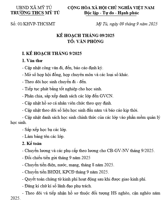 KẾ HOẠCH VĂN PHÒNG THÁNG 9/2025