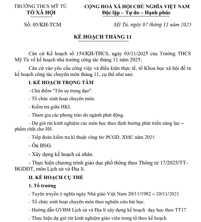 KẾ HOẠCH THÁNG 11/2025 TỔ XH