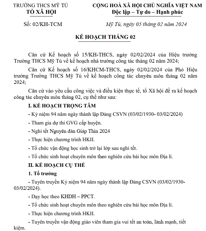 KẾ HOẠCH TỔ XÃ HỘI THÁNG 02/2024