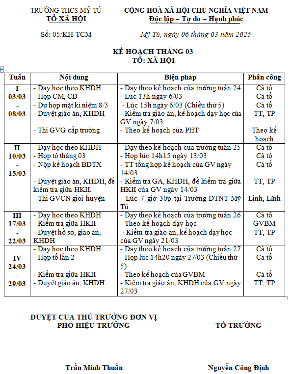 KẾ HOẠCH TỔ XÃ HỘI THÁNG 03/2025