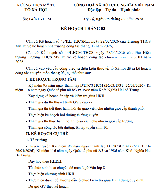 KẾ HOẠCH TỔ XÃ HỘI THÁNG 03/2026