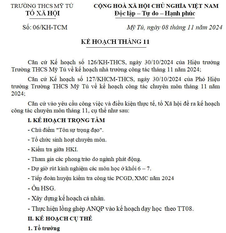KẾ HOẠCH TỔ XÃ HỘI THÁNG 11/2024